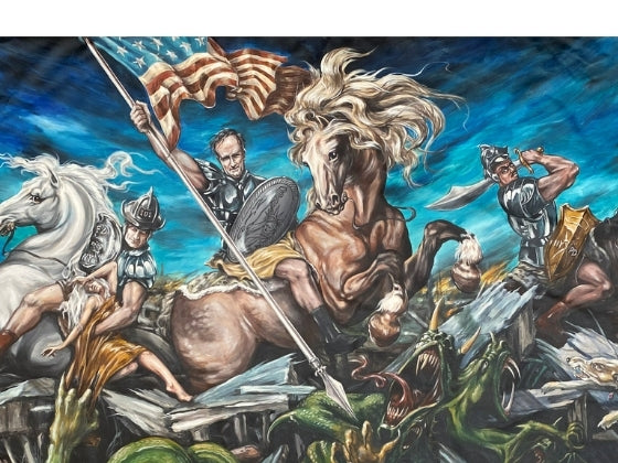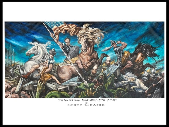 This artist signed print dates back to shortly after 9/11/2001. Depicted include FDNY-RUDY-FDNY. Available for the first time as artist signed print in honor of the upcoming 20th anniversary of 9/11. Please note: 12” x 22” mat poster print.